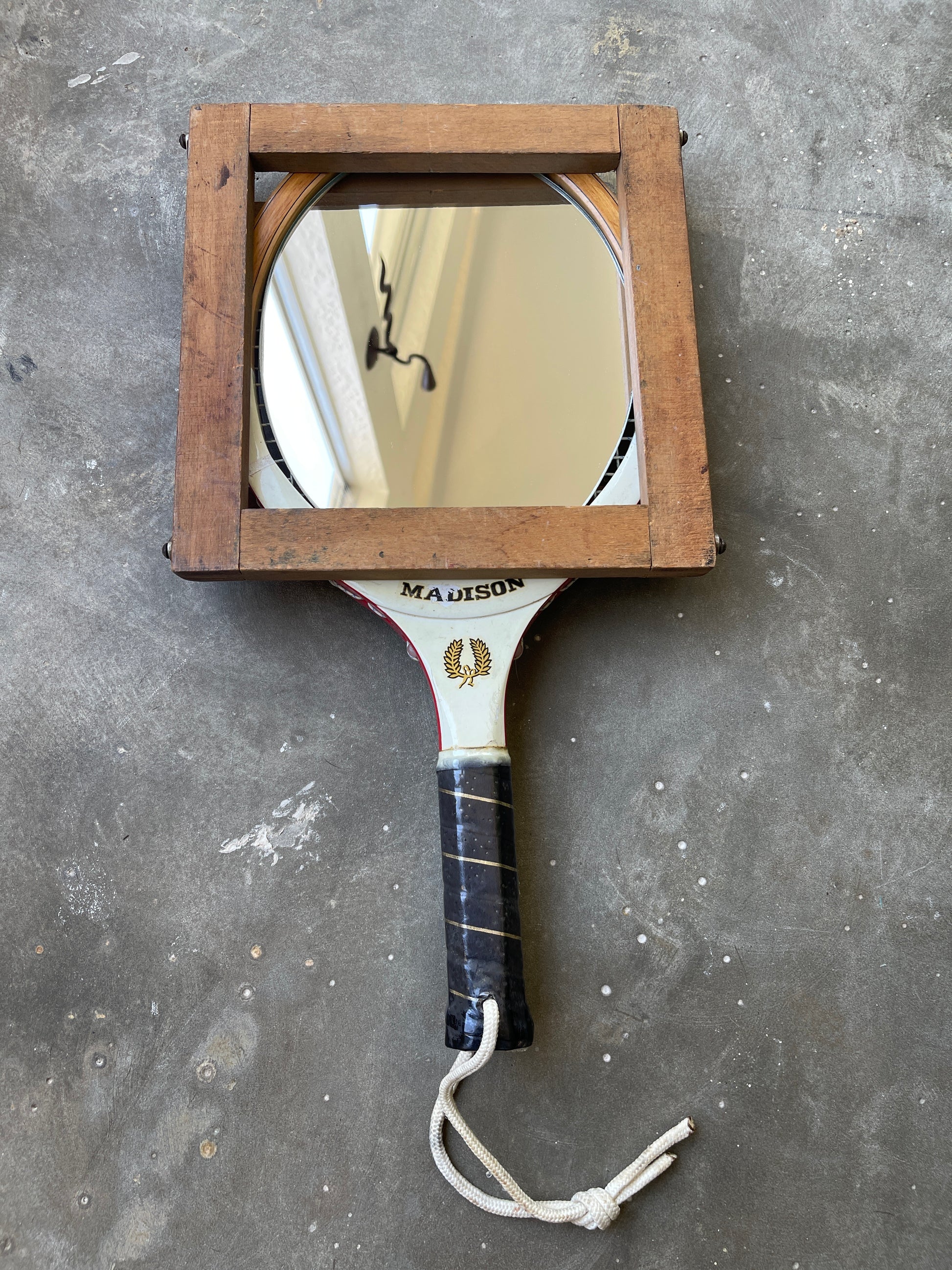 Upcycled 1970s-80s vibtage wood paddleball racket. dimensions: 45.5 cm x 22.5 cm x 2.5 cm comes with vintage wood press dimensions: 24.5 cm x 24.5 cm x 5.5 cm