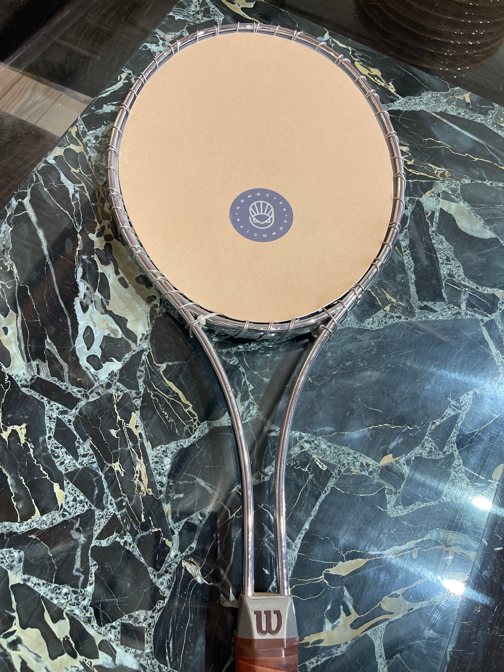 Upcycled vintage chrome tennis racquet mirror